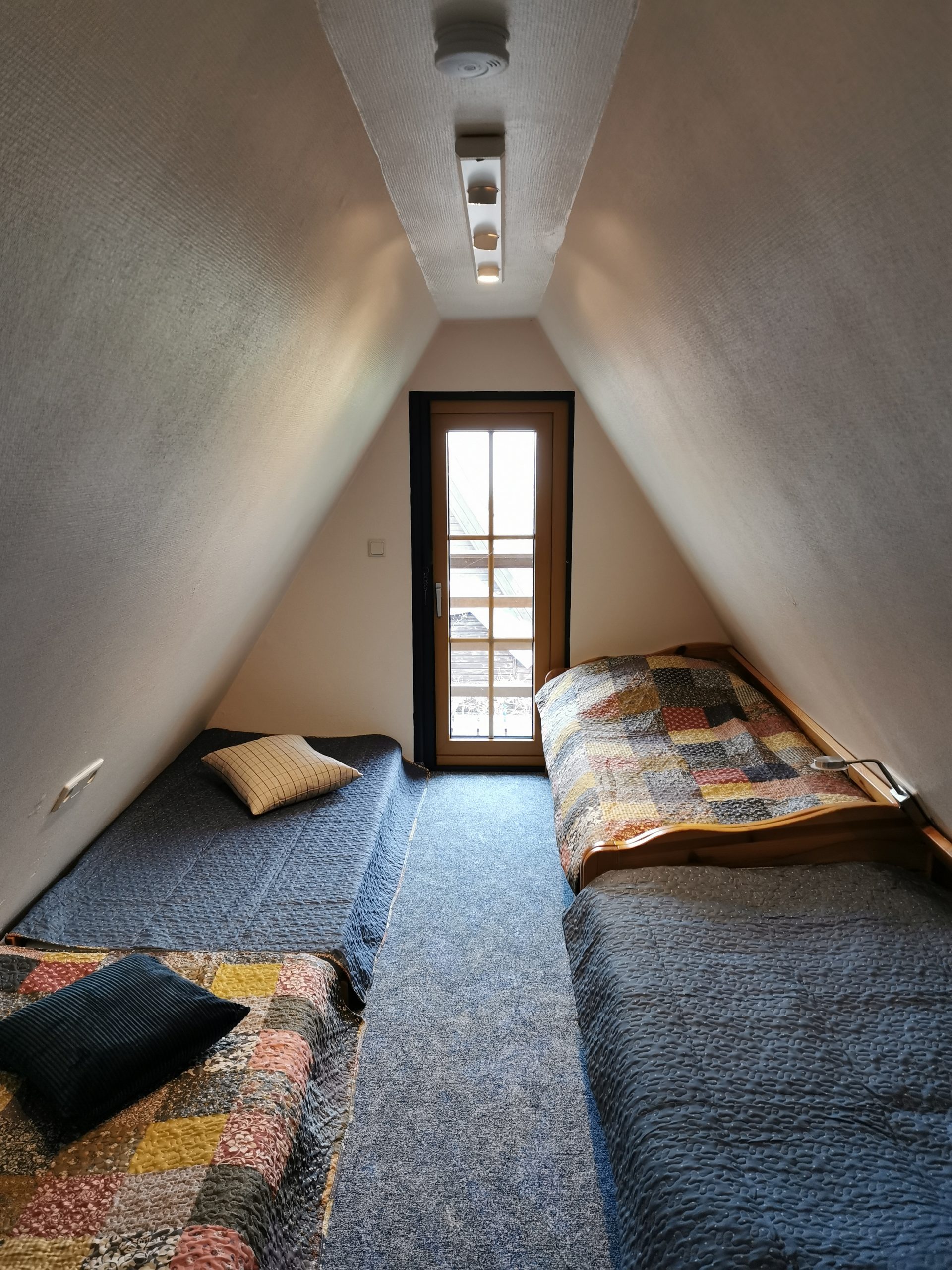 Im Obergeschoss befindet sich der Schlafraum mit bis zu 4 Einzelbetten. Vom Schlafraum geht man direkt auf den Balkon, um von dort den fantastischen Blick zum Greifswalder Bodden zu geniessen.