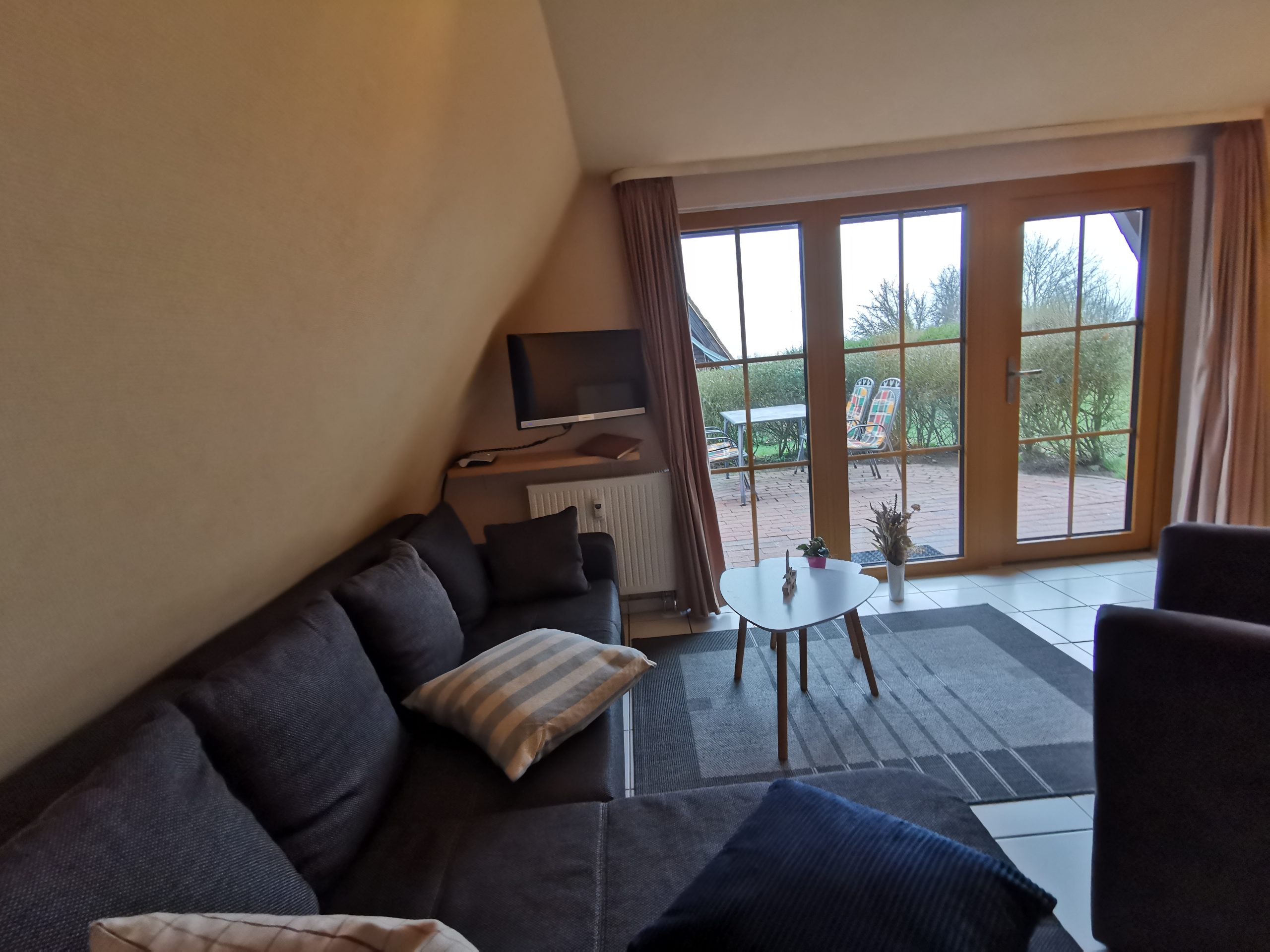 Im Erdgeschoss befinden sich der gemütlich eingerichtete Wohn –und Essbereich, ausgestattet mit einer modernen Miniküche mit Kühlschrank und Gefrierfach, Mikrowelle sowie vorhandenem Wasserkocher, Kaffeemaschine und Toaster. Der Wohnbereich ist besonders gemütlich eingerichtet mit einer Sofasitzecke und einemSessel, dazu gehört ein Flachbildfernseher inkl. Radioempfang. Ein Haustelefon ist ebenfalls nutzbar.